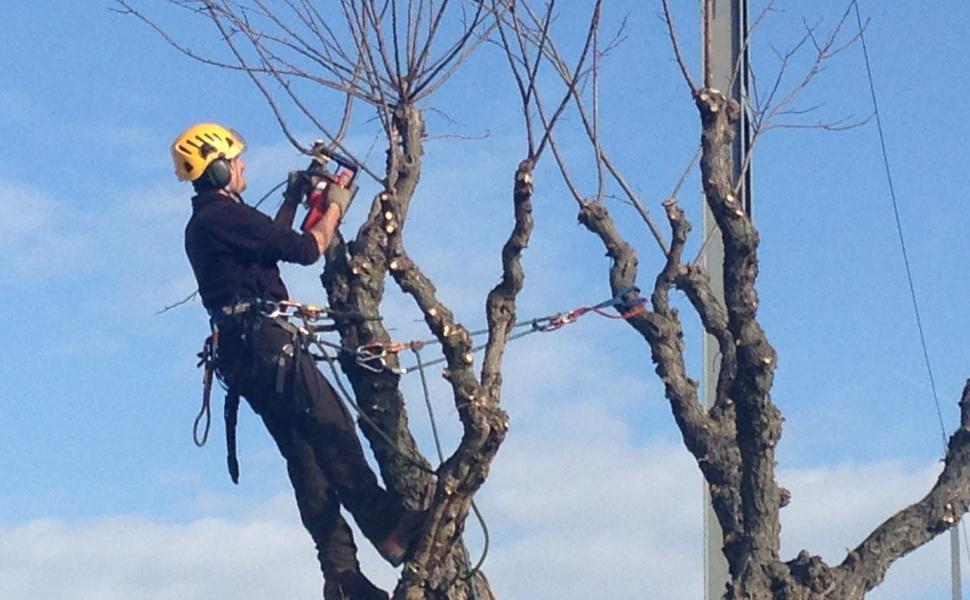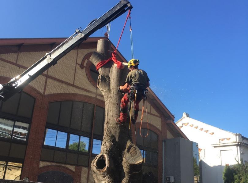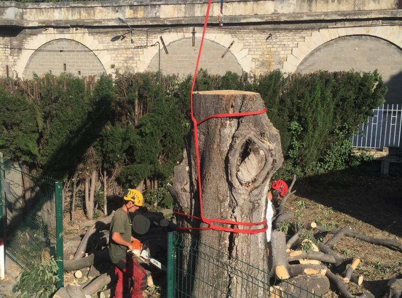 Démontage et abattage d'un arbre (gros micocoulier, taille 25 m) dans un environnement contraignant (habitation et clôtures à proximité).