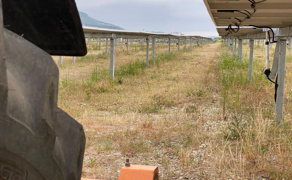 Entretien d'un parc photovoltaïque d’une surface de 25 hectares sur la commune de Caderousse (Vaucluse) - Tonte mécanique et manuelle sous les panneaux et autour de poteaux, de façon délicate en raison d'un fort risque de projection.