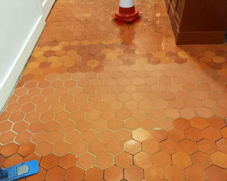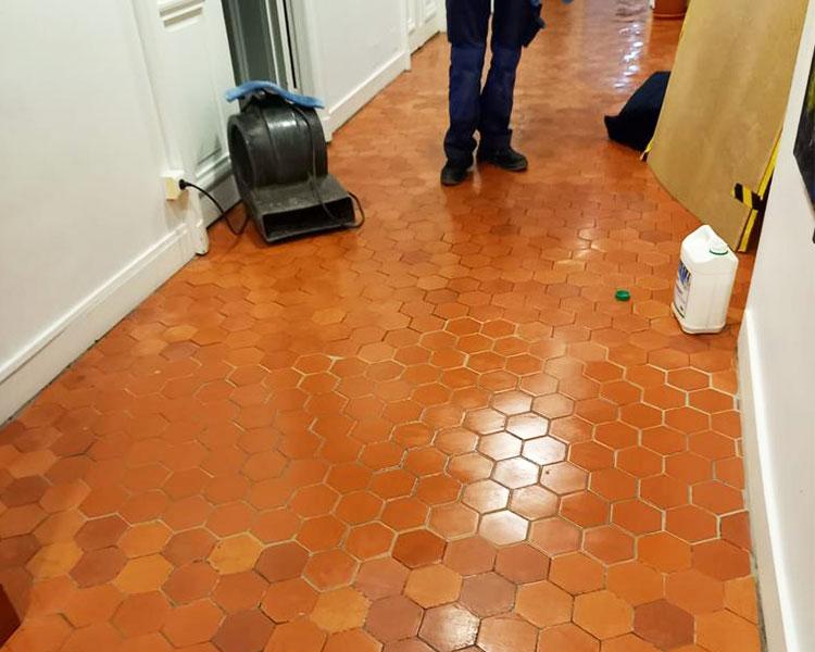 Deux de nos collaborateurs en propreté se sont rendus sur place afin de protéger et de donner une couleur vive aux tomettes remplacées.
