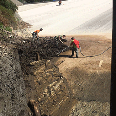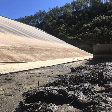Avec un accès difficile au site, l'équipe Travaux publics a été missionnée pour nettoyer le masque du barrage. En effet, le limon colmaté était épais et s'accompagnait de bois enchevêtrés. Le masque de barrage doit être étanche sur toute sa surface, un soin particulier doit lui être porté afin qu'il ne soit pas contourné.