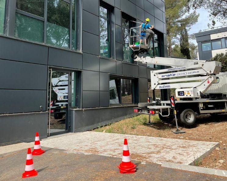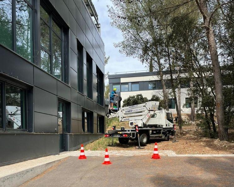 Un chantier plutôt difficile d'accès pour notre équipe, dû à un terrain en dévers tout autour du bâtiment. Pour atteindre les fenêtres de tous les étages en toute sécurité, nous avons utilisé 3 camions à nacelles télescopiques, avec stabilisateurs.
