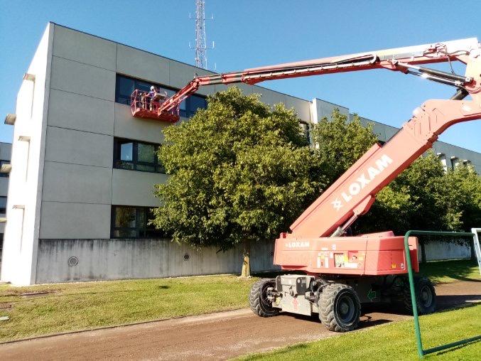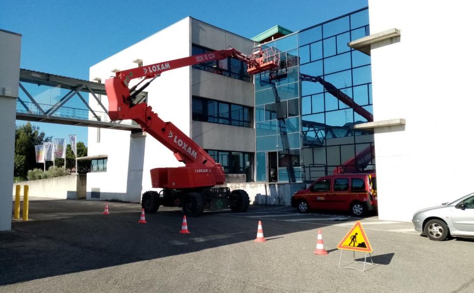 Nettoyage de vitres d'un batîment comprenant de vitrage. Nettoyage réalisé de plein pied pour les intérieurs et à l'aide d'une nacelle automotrice 40 m pour les vitrages extérieurs. Mise en sécurité de l'intervention.