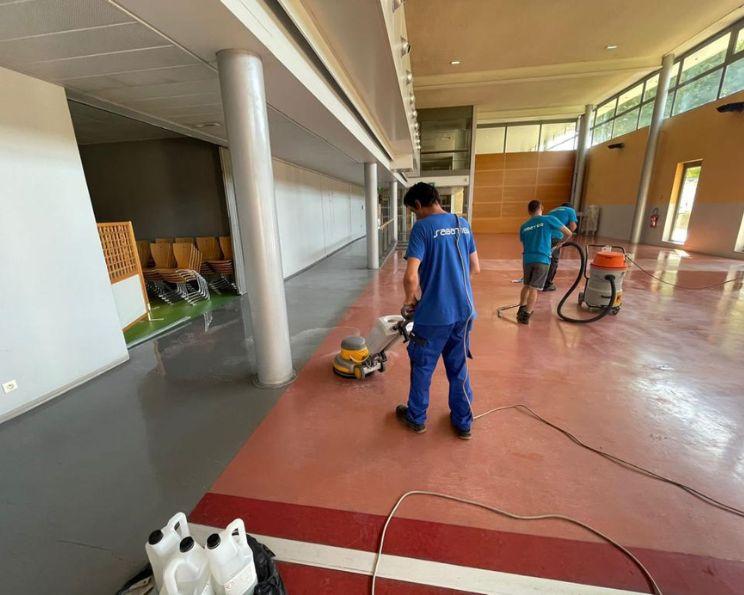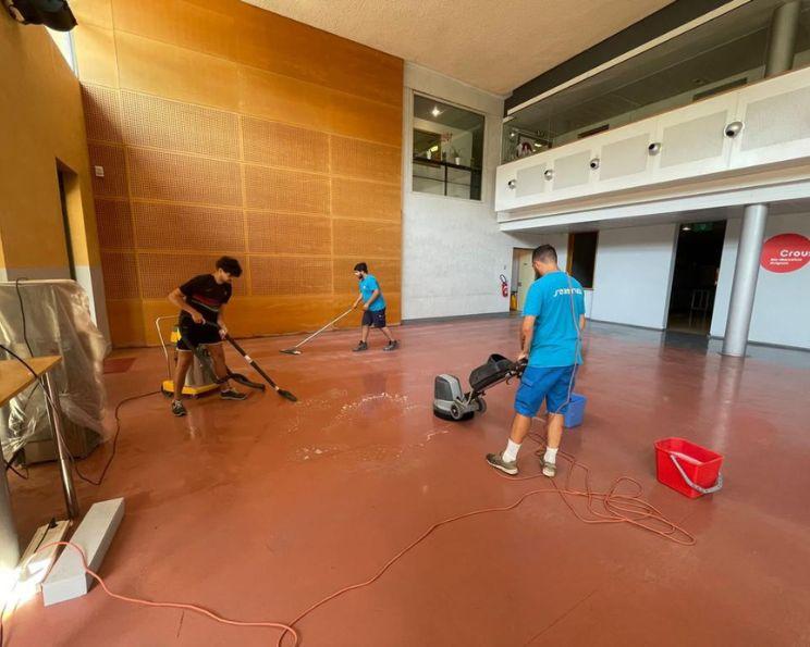 Cinq de nos agents de propreté se sont mobilisés le temps d'une journée pour décaper et mettre en cire le sol thermoplastique de la salle commune du restaurant, soit une surface totale de 480 m².