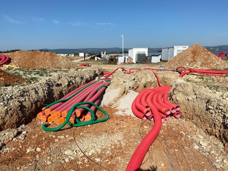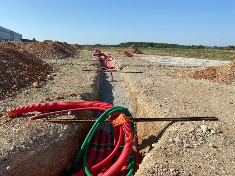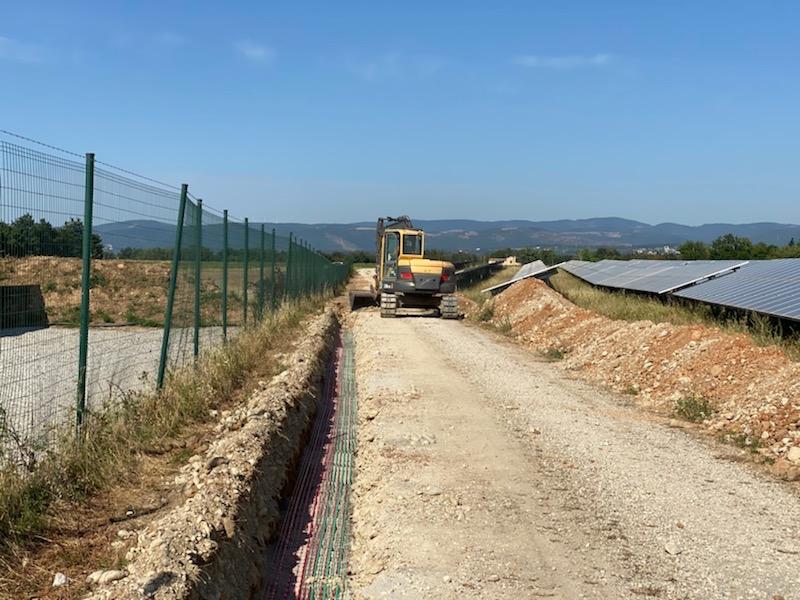 Mise en place du réseau d’un parc photovoltaïque avec 1000 mètres de tranchée. Pose de fourreaux de 3000 ml réseau sec et HTA. Mise en place de remblais, sable et grillages avertisseurs pour une mise en sécurité, puis compactage.