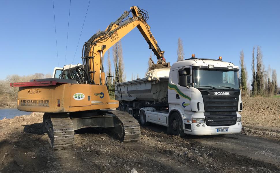 Restauration d’une berge dans un virage avec une contrainte hydraulique forte du fait des variations de niveau d’eau régulier , technique mixte qui permet d’éviter le sous-cavement de la berge et de reconstituer un talus en gardant une quasi-verticalité.